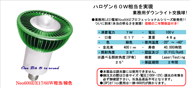 ● 長寿命性 ● ※一般的ハロゲン電球:約3000時間 ※Neo600Z E17シリーズ:約40000時間 その差は約13倍! 業務用には頼もしい二年間保証付き |